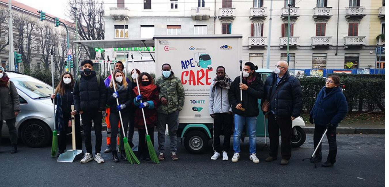 Questo è il progetto e la sfida dei giovani di «ApeCare» che da  gennaio tessono legami nel quartiere Aurora: spazzano un po’ di rifiuti non per sostituirsi ai netturbini, ma per coinvolgere le persone più fragili, per stabilire un dialogo a partire da una azione semplice come quella di usare ramazza e paletta, per fare emergere il volto bello e vitale del quartiere: il volto sorridente della signora italiana che da quando li vede al giovedì (i passaggi dell’«ApeCare» sono tre a settimana) sforna una torta per loro e la offre in strada e ti racconta che lei non si fa problemi «anche la sera tardi, se vedo che qualche ragazzo lascia le bottiglie in giro, io glielo faccio notare perché non bisogna rinunciare a dire come ci si deve comportare», o quello del giovane gambiano che al ritorno dal lavoro mette la musica per tutti e accompagna a ritmo i pulitori… o ancora quello del giovane marocchino che sale in casa e arriva con la sua ramazza e chiede se anche lui può dare una mano «perché qui non siamo tutti criminali, ci si aiuta…».
