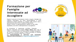 La formazione è organizzata dal nostro Ufficio in collaborazione con l’Associazione Famiglie Accoglienti, nell’ambito del progetto Rifugio Diffuso – Accoglienza in famiglia promosso dall’Ufficio Stranieri della Città di Torino.